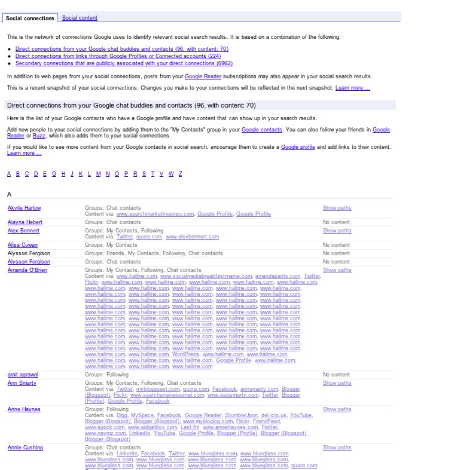 Anyone can see their own list if you’re logged into Google, just go here, you’ll see something similar to what you see below. This is my own personal social data, so you can see how socially active my friends are. At least my friends that begin with the letter “A”.